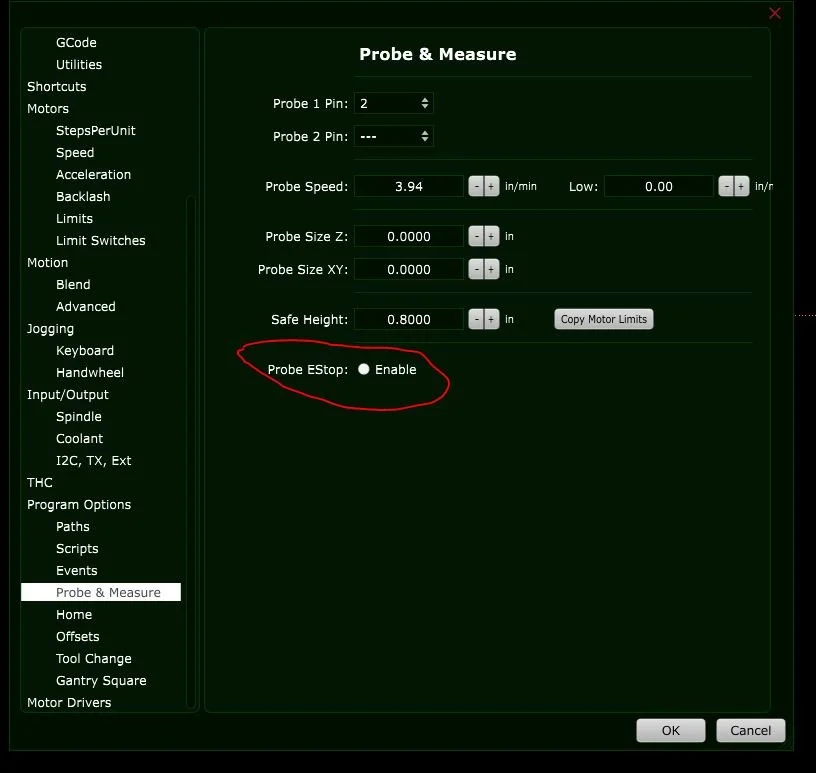 In the list on the Left side of the settings window, scroll down and click on “Probe and Measure” Make sure that the Probe Estop Enable is UNCHECKED