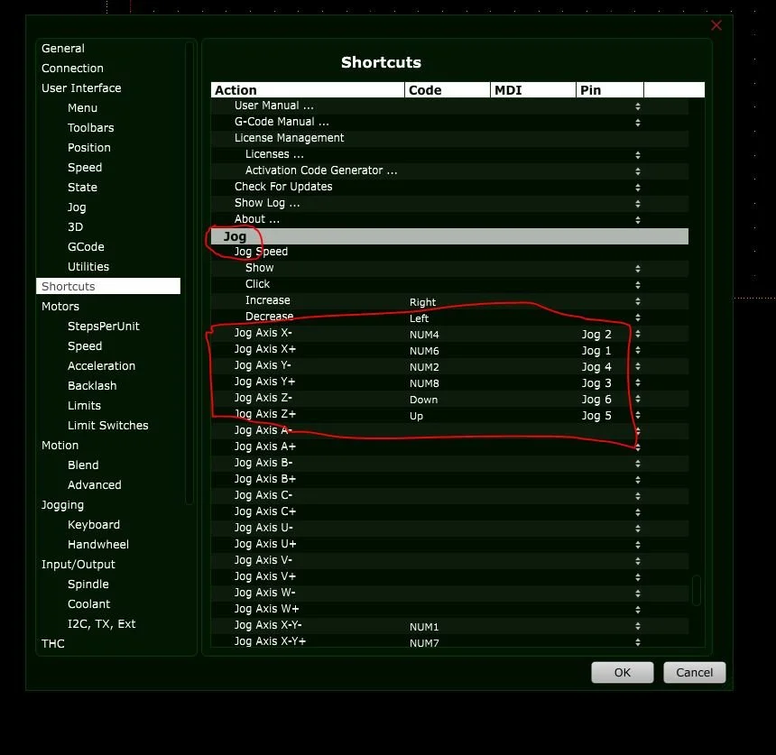 After clicking on “Shortcuts” from the left menu….On the Right scroll down the list until you find the JOG section